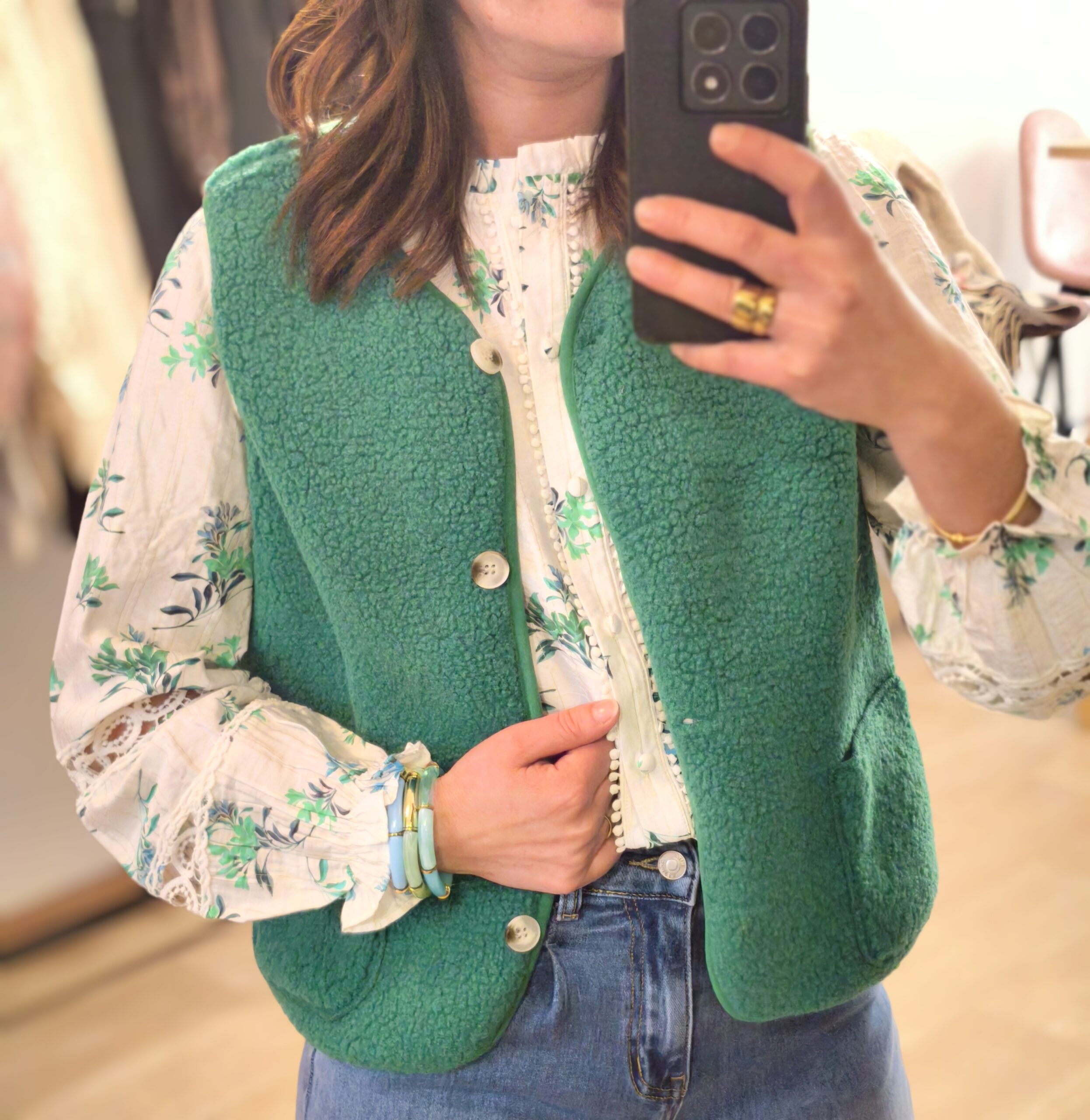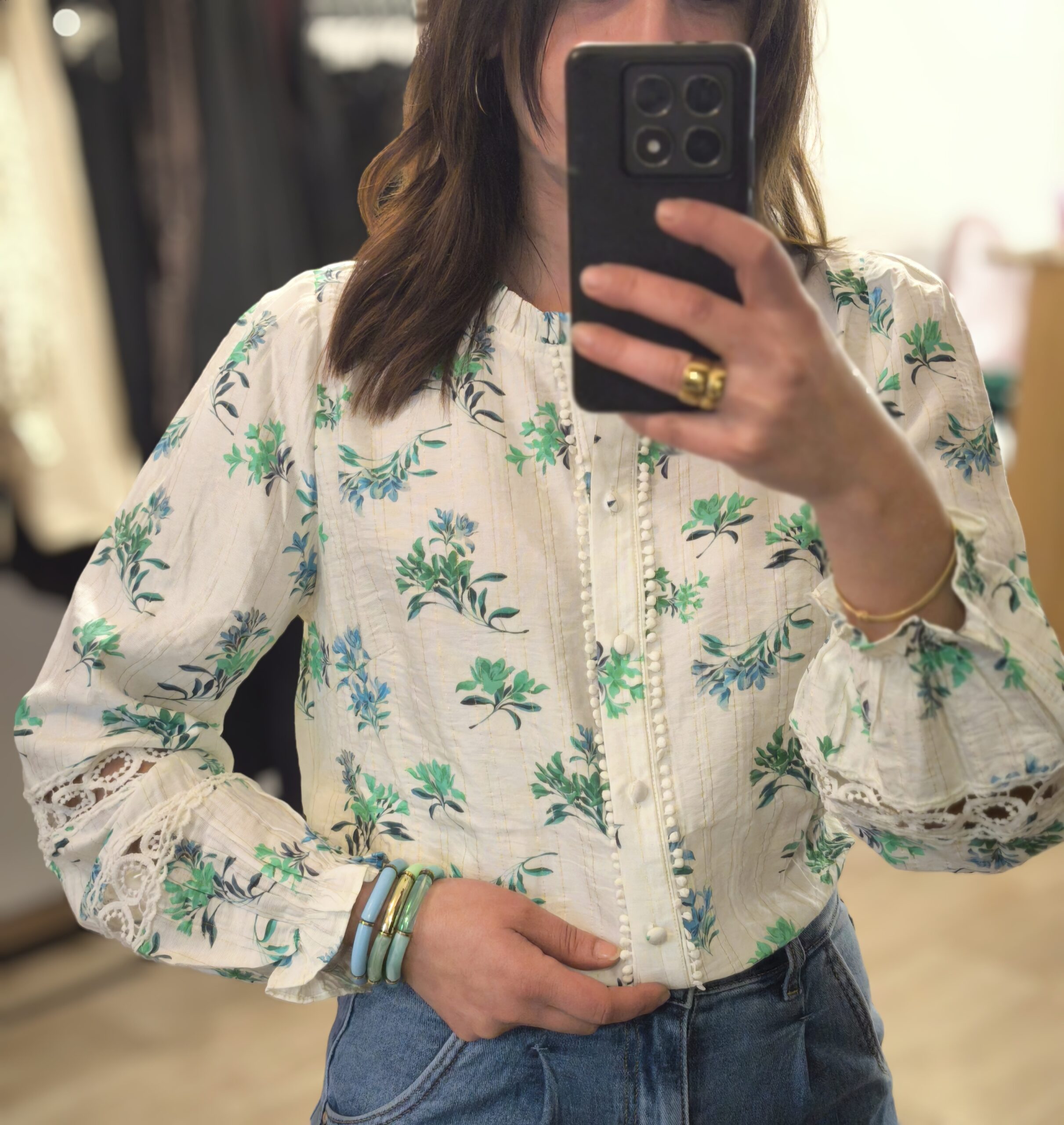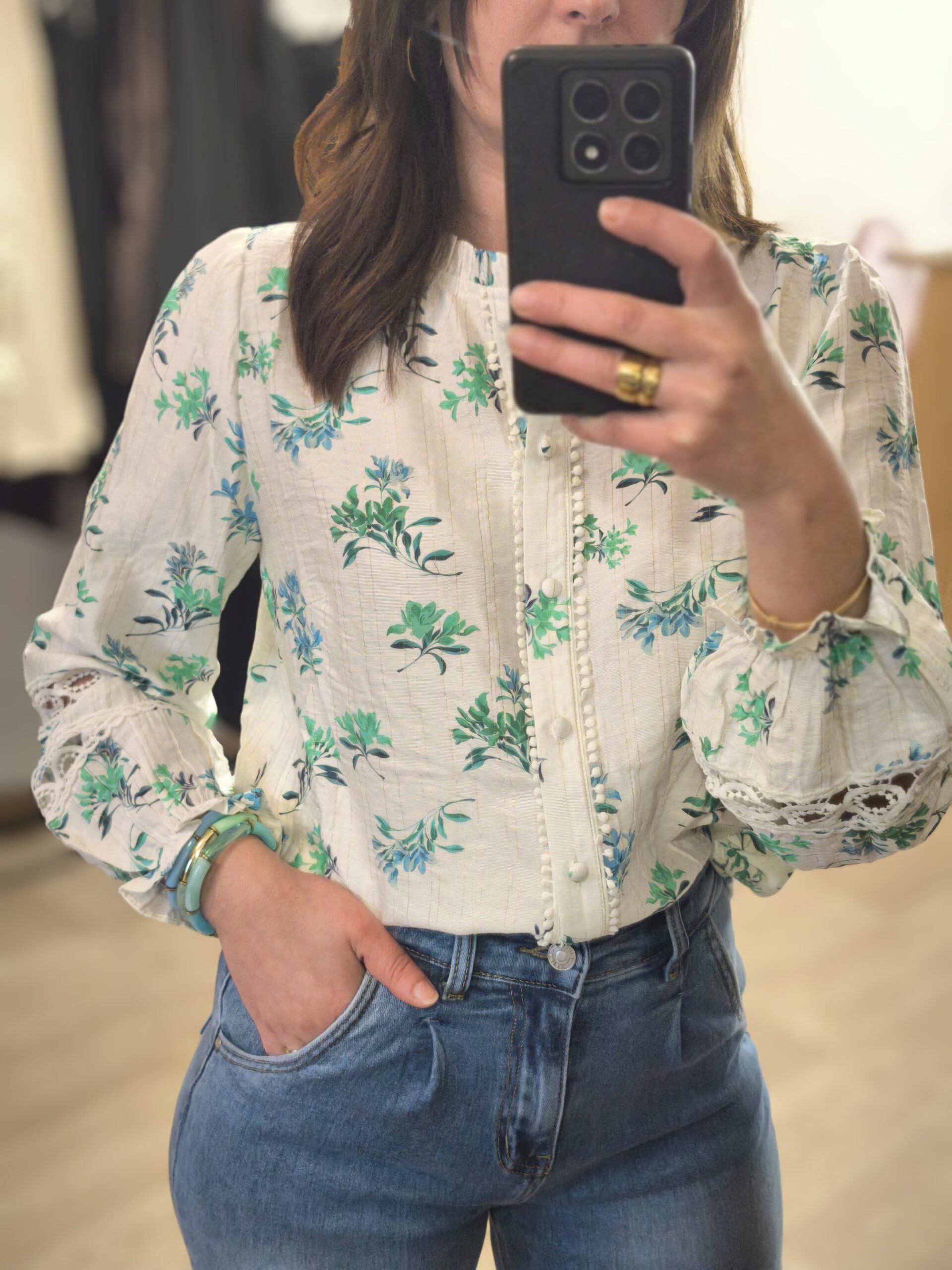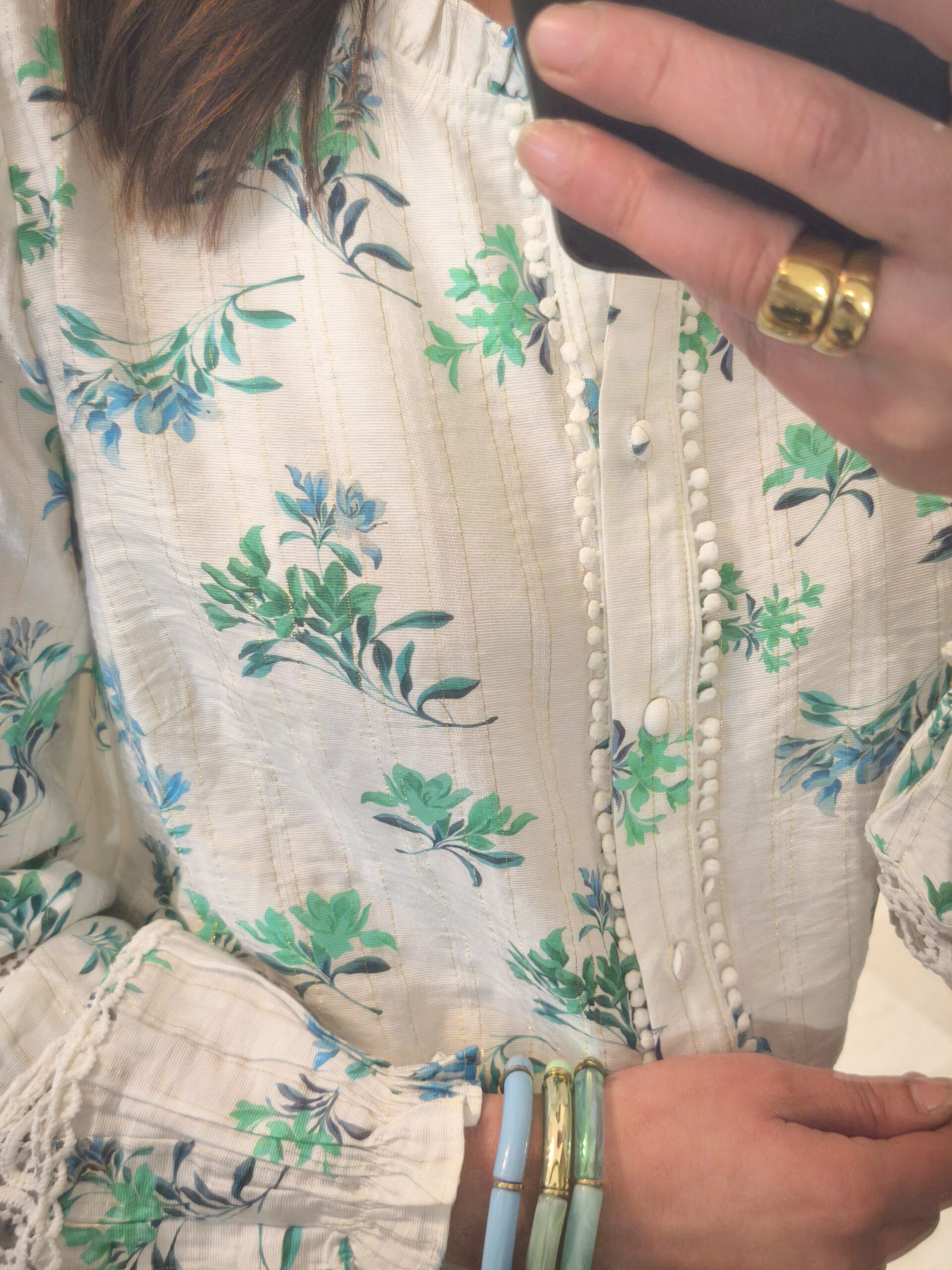 - Blouse motif fleure vert taille SM ou ML : 36/38 OU 38/40 , avec dentelle au niveau des manches