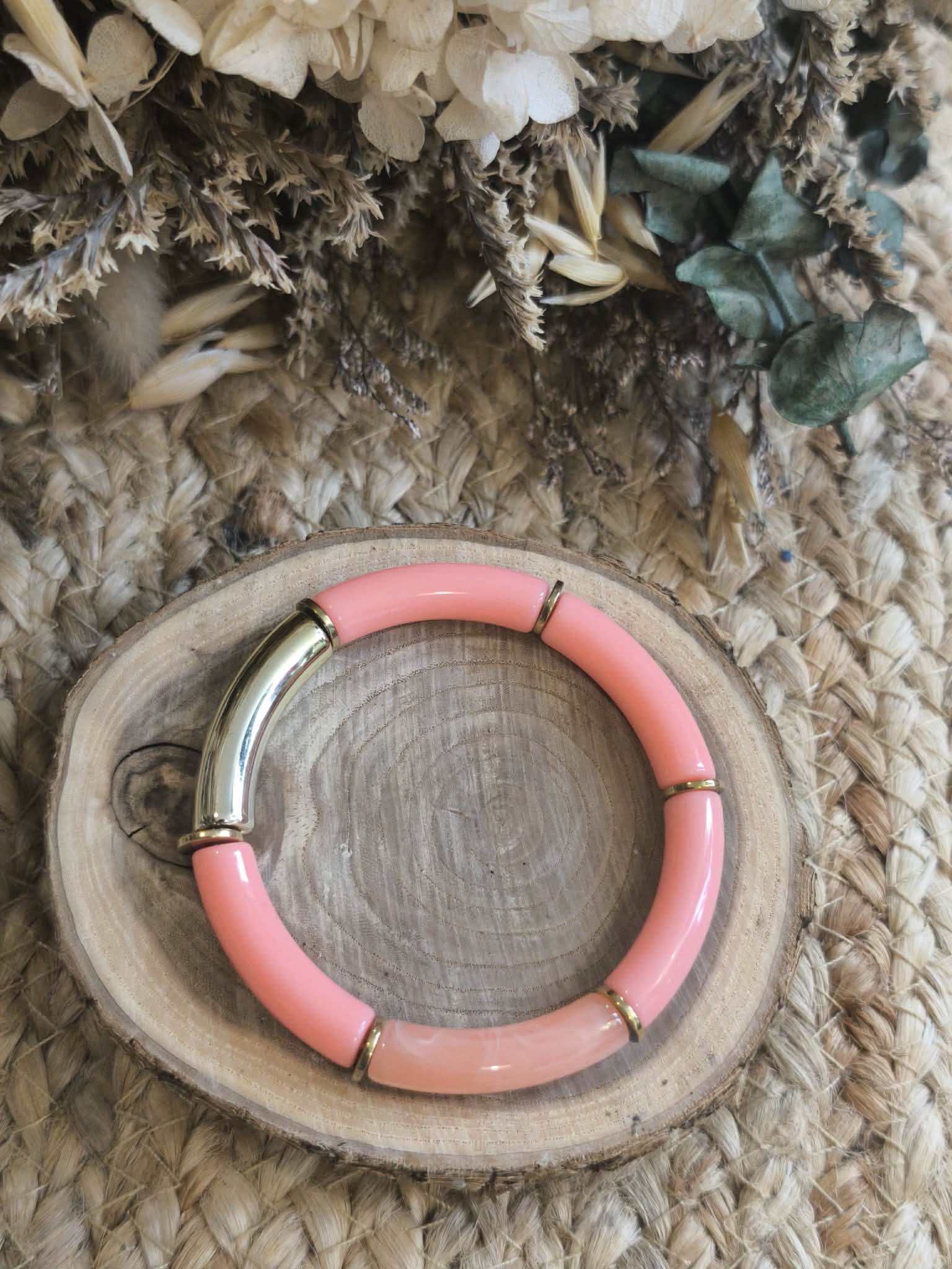 Bracelet élastique composé de perles tubulaires aux nuances de rose saumon, rehaussées de détails dorés, pour un style frais, élégant et lumineux.
