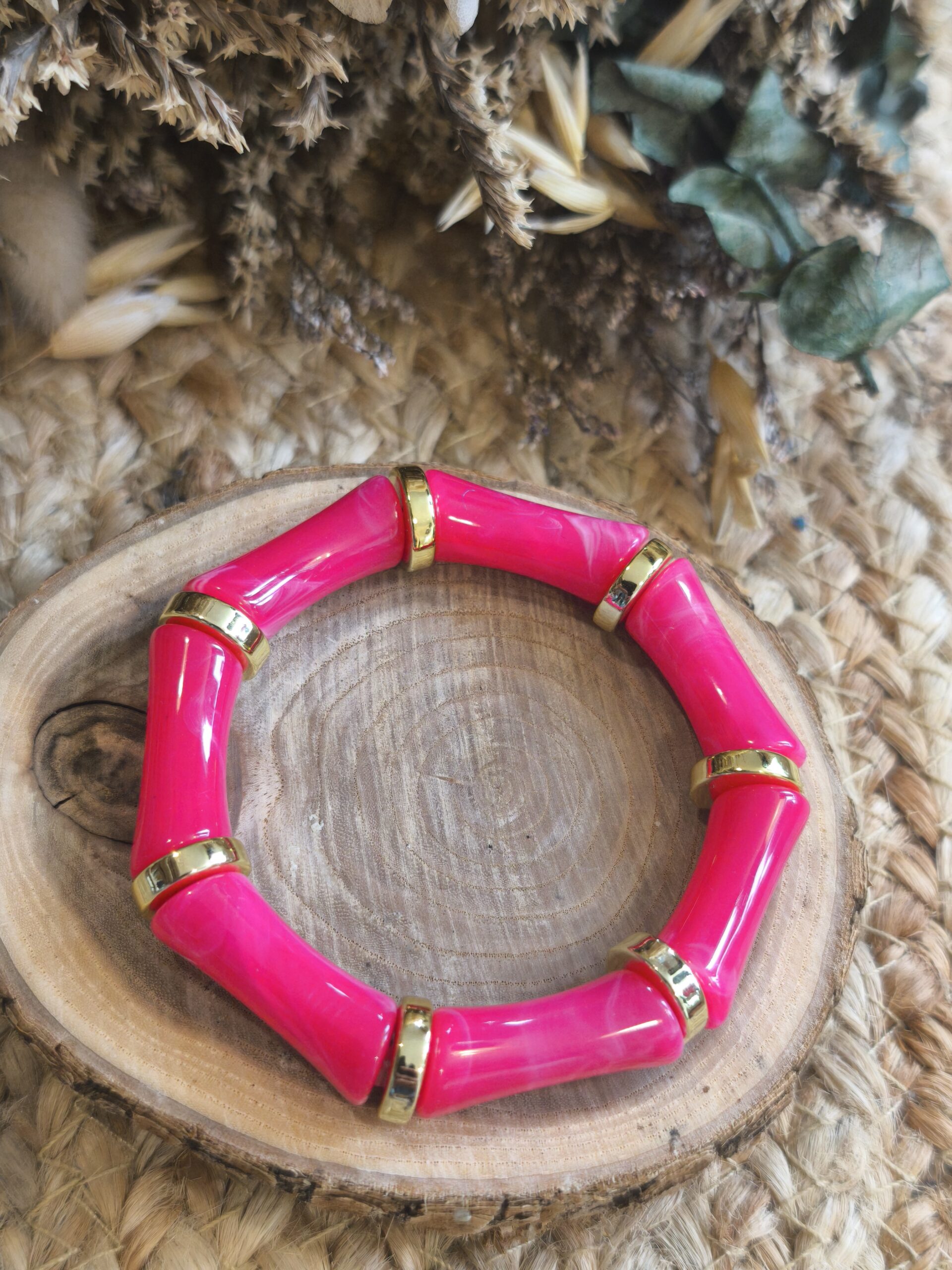 Bracelet élastique composé de perles tubulaires rose fuchsia brillantes et d’intercalaires argentés, idéal pour apporter une touche de couleur à vos tenues.