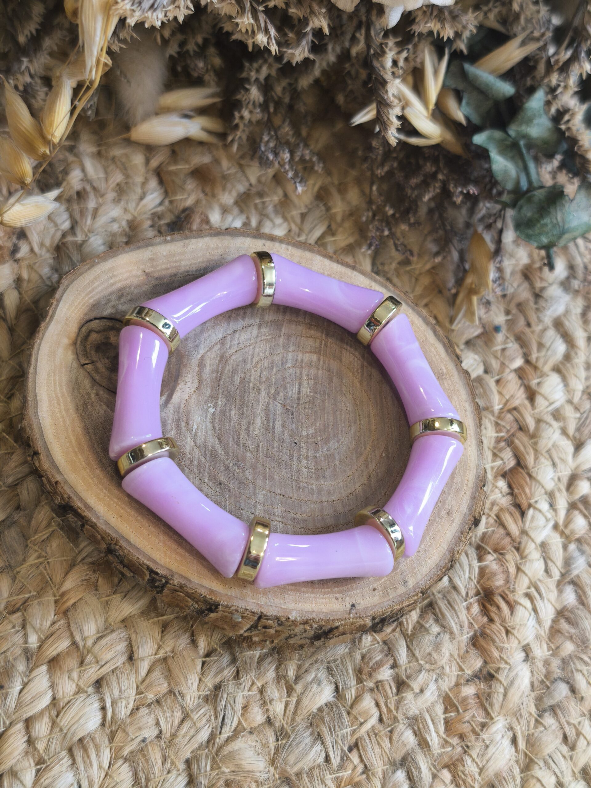 Bracelet élastique composé de perles tubulaires violet brillantes et d’intercalaires argentés, idéal pour apporter une touche de couleur à vos tenues.