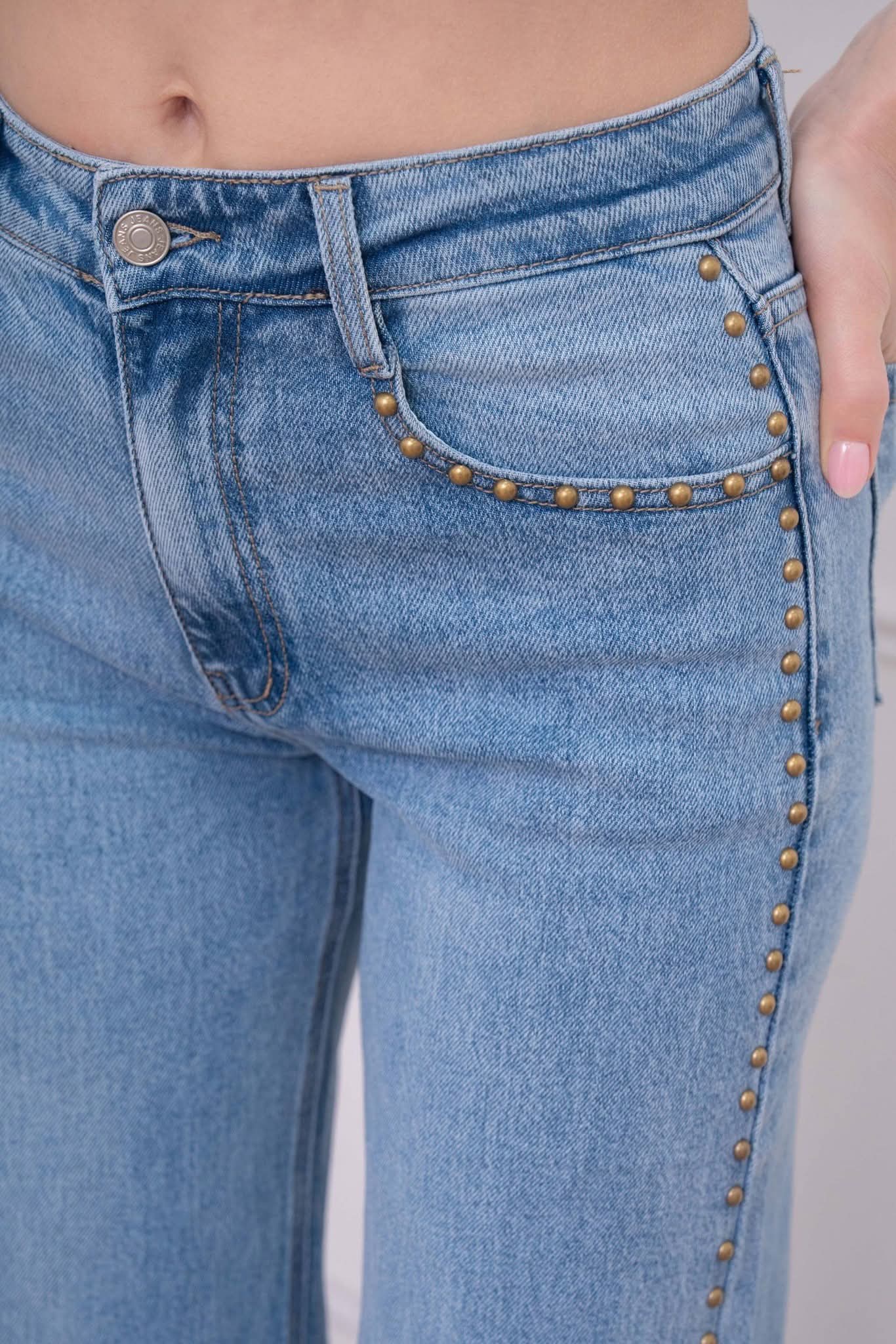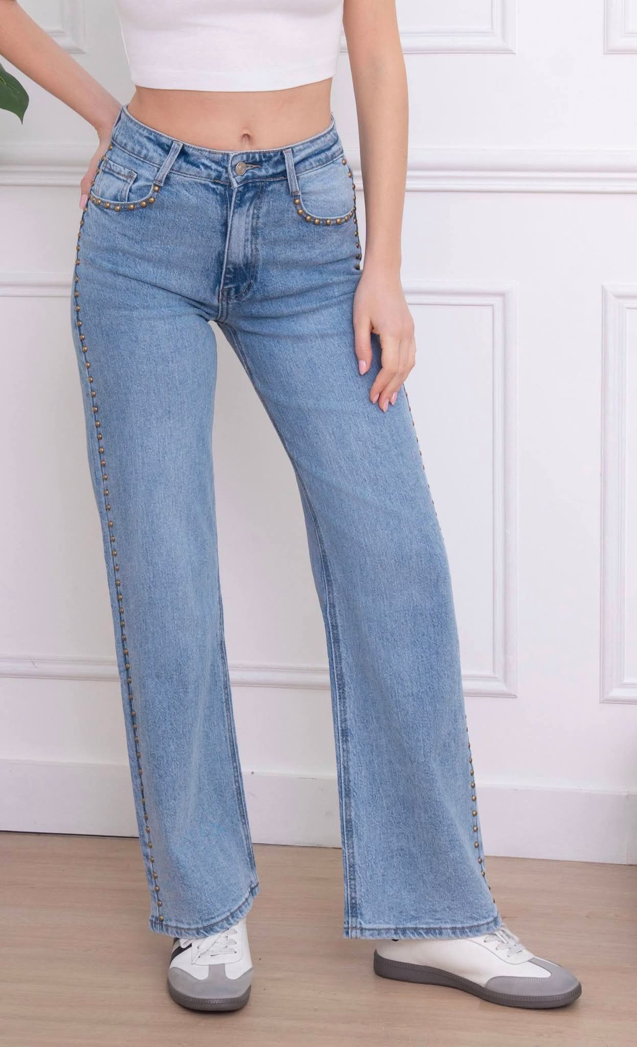 - Jean taille haute à coupe large , denim clair et détails clouté sur les cotés
